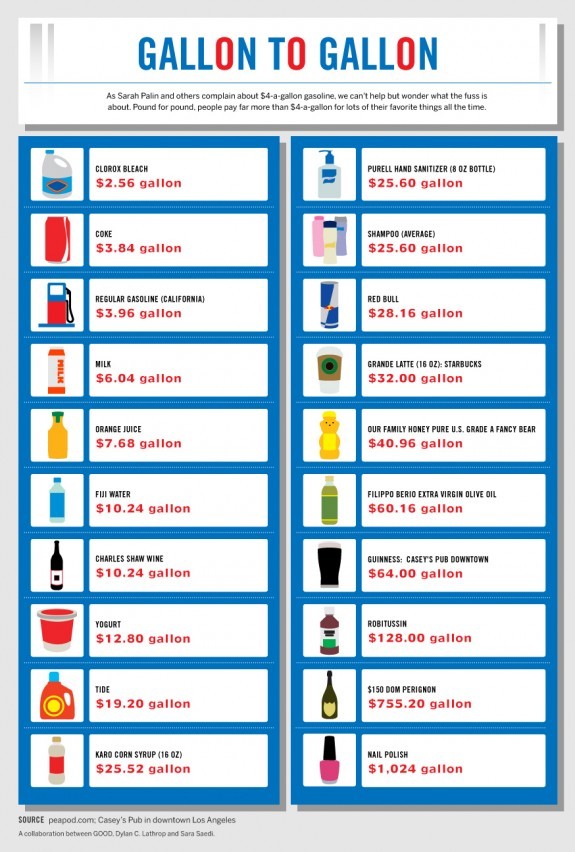 Gallons of stuff that cost more than gasoline Posted bySteve Banfield March 25, 2011September 29, 2011 Leave a comment on Gallons of stuff that cost more than gasoline via flowingdata.com Discover more from stevebanfield.blog Subscribe to get the latest posts sent to your email. Type your email… Subscribe Share this: Share on X (Opens in new window) X Share on LinkedIn (Opens in new window) LinkedIn Email a link to a friend (Opens in new window) Email Like Loading... Published by Steve Banfield Kentucky born, Seattle based. Entrepreneur. Team Builder. Photographer. View more posts